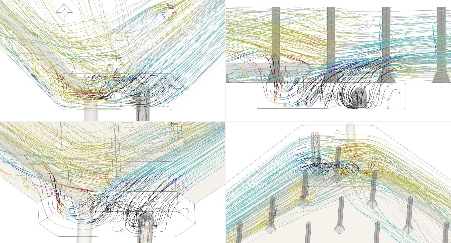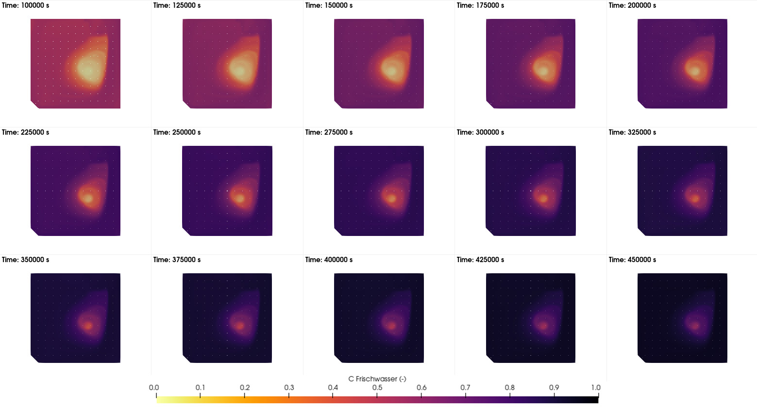 Ziel des Projektes war die Optimierung der Zulaufsituation und der Nachweis der Durchmischungsdauer / Aufenthaltsdauer des Trinkwassers im Behälter. Auf Basis der 3-D-Strömungssimulation und instationären Lösung der Transportgleichungen wurden Metriken entwickelt und die MRT (Mean Residence Time) sowie die max. Aufenthaltsdauer des Wassers ermittelt. Teil des Projektes war der Nachweis der Netzunabhängigkeit der Ergebnisse sowie eine Validierung der Methodik.